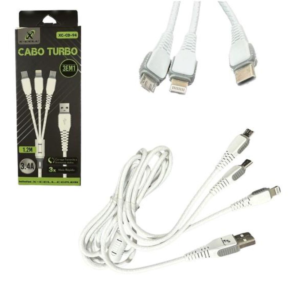 Os cabos da linha 3 em 1 são cabos de alta performance e durabilidade, garantindo maior segurança ao utiliza-lo. Eles possuem conectores Micro Usb, USB-C e Lightning.